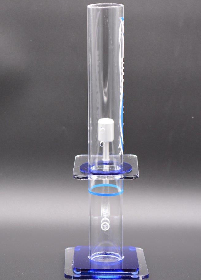 Our Classic Angled Series (our first product) has a 2” round acrylic main draw tube, a .250 thick clear acrylic base, a .250 thick colored acrylic top base plate, a .250 thick clear acrylic top tray, a .500 OD down tube, the whole assembly is laid back 5 degrees, to facilitate an easier usage. The base plate assembly is large enough to keep the unit from falling over.